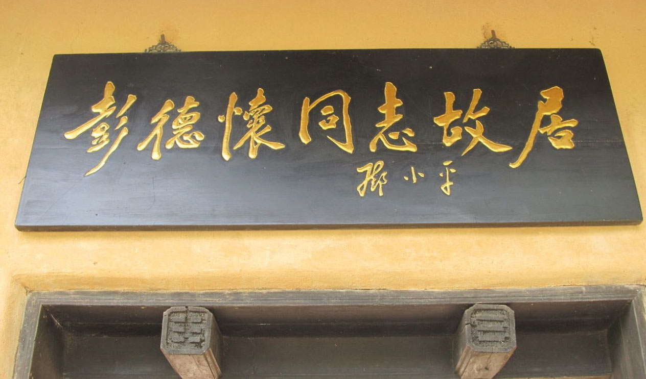 走过轩敞的三合土地坪,便是正屋。堂屋门楣上,嵌着祁阳石雕刻的横额门匾,邓小平所书“彭德怀同志故居”七字,金光熠熠,耀眼生辉。堂屋正中,挂着彭德怀身穿元帅服,显得十分威严而安详的巨幅彩色照片;两边墙上,列有他的生平主要活动年表。