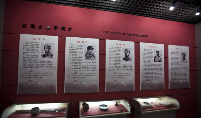 狼牙山五勇士陈列馆于2001年落成,由杨成武将军亲笔题写馆名。陈列馆占地面积816平米,建筑面积300平米,馆内设有图片,历史资料,抗战文物,战斗场景等四个展厅,生动再现了我抗日军民在党的领导下,抗击日寇,保家卫国的英雄业绩和悲壮历史,也进一步揭示了日寇在我根据地犯下的滔天罪行。陈列馆运行后,前来接受爱国主义教育的党员、团员。军人、学生等络绎不绝。尤其是"七一"、"十一"期间,由当年老党员、老八路所作的专题报告更是吸引游客驻足倾听。抗日战争时期,在河北省易县狼牙山战斗中英勇抗击日伪军的八路军5位英雄,用生命和鲜血谱写出一首气吞山河的壮丽诗篇。他们是八路军晋察冀军区第1军分区第1团第7连第6班班长、共产党员马宝玉,副班长、共产党员葛振林,战士宋学义、胡德林,胡福才。 1941年8月,侵华日军华北方面军调集7万余人的兵力,对晋察冀边区所属的北岳、平西根据地进行毁灭性“大扫荡”。9月25日,日伪军约3500余人围攻易县城西南的狼牙山地区,企图歼灭该地区的八路军和地方党政机关。晋察冀军区第1军分区某部第7连奉命掩护党政机关、部队和群众转移。完成任务撤离时,留下第6班班长马宝玉等5名担负后卫阻击,掩护全连转移。他们坚定沉着,利用有利地形,奋勇还击,打退日伪军多次进攻,毙伤90余人。次日,为了不让日伪军发现连队转移方向,他们边打边撤,将日伪军引向狼牙山棋盘陀峰顶绝路。日伪军误认咬住了八路军主力,遂发起猛攻。5位临危不惧,英勇阻击,子弹打光后,用石头还击,一直坚持战斗到日落。面对步步逼近的日伪军,他们宁死不屈,毁掉枪支,义无反顾,一个接一个纵身跳下数十丈深的悬崖。班长马宝玉、战士胡德林、胡福才壮烈殉国没了;但是副班长葛振林、战士宋学义被山腰树枝挂住,幸免于难。马宝玉等5位的壮举,表现 了崇高的爱国主义、革命英雄主义精神和坚贞不屈的民族气节,被人民群众誉为“狼牙山五壮士”。晋察冀军区领导机关授予3名烈士“模范荣誉战士”称号,并追认胡德林、胡福才为中国共产党党员;通令嘉奖副班长葛振林、战士宋学义,并授予“勇敢顽强”奖章,宋学义光荣加入中国共产党。为纪念和表彰5位抗日英雄,当地革命政府在棋盘陀峰顶修建了“狼牙山三烈士碑”。