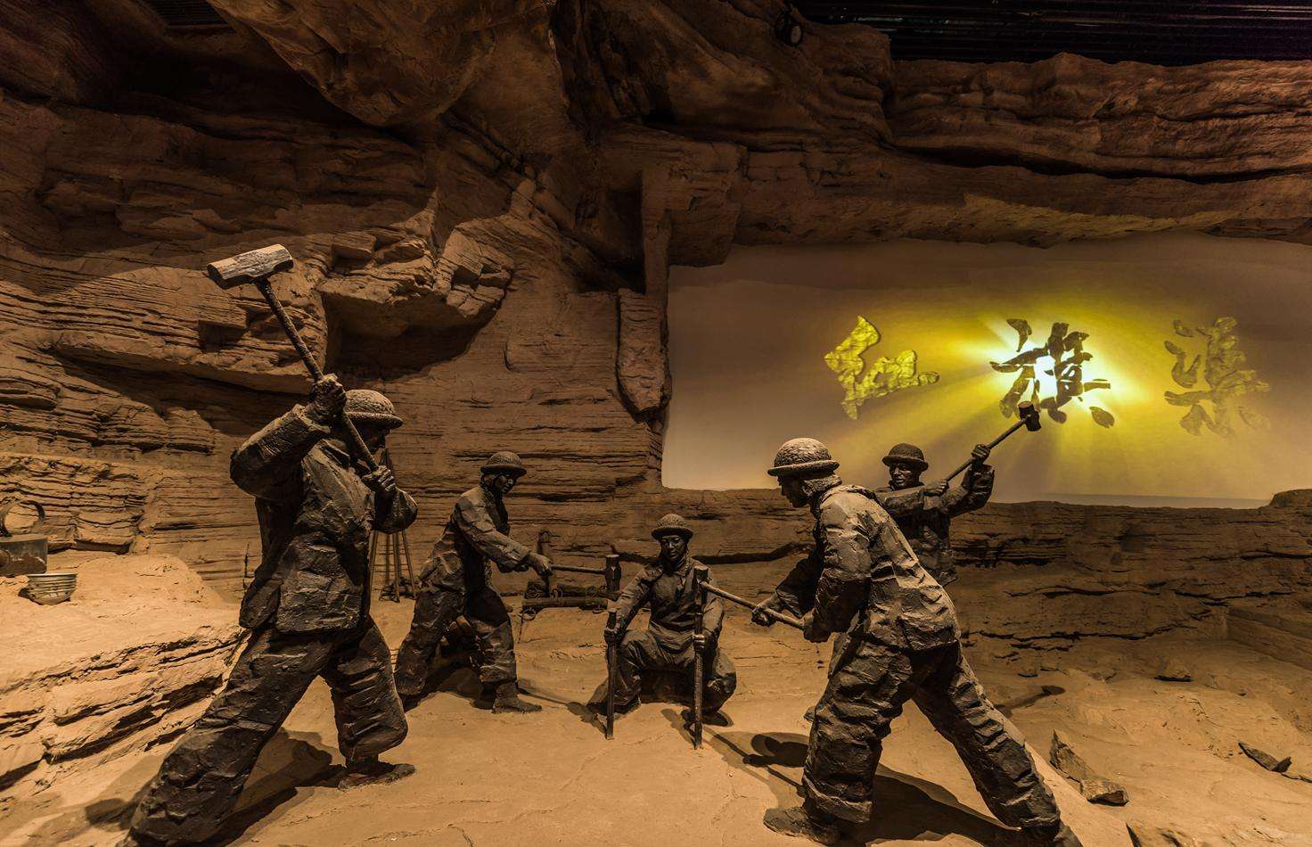 红旗渠纪念馆通过515米长的展线,采用空间环境、雕塑、绘画、多媒体等艺术手段,营造了再现历史、触摸历史、穿越历史、对话 历史的效果与氛围,从而使人们深刻感悟红旗渠精神,不忘昨天的苦难辉煌,不负今天的使命重托。