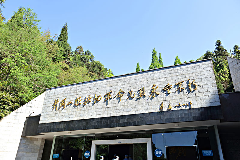 登上宽阔的台阶即进入纪念堂。纪念堂大门上方烫金横幅“井冈山根据地革命先烈永垂不朽”是彭真委员长1987年视察井冈山时为陵园题写的。纪念堂设有瞻仰大厅、陈列室、吊唁大厅、忠魂堂。 瞻仰大厅正面汉白玉墙面的“死难烈士万岁”六个大字是毛泽东1946年为革命烈士题写的。正面玻璃柜存放的是井冈山革命烈士的名册。大厅内放置的花圈、花篮,有党和国家领导人来井冈山时向烈士们敬献的,有社会团体及旅游观光团敬献而留下来作为纪念的。 瞻仰大厅左侧陈列室展览的人物是建国后去世的参加过井冈山斗争的领导人的挂像。目前有51位。他们当中有开创井冈山革命根据地的主要领导人毛泽东、朱德、彭德怀、陈毅;有军队中的一大批将帅;如元帅朱德、彭德怀、陈毅、罗荣桓。大将谭政、粟裕、黄克诚。上将陈伯钧、赖传珠、杨得志、朱良材。中将杨梅生、毕占云、张国华、谭家述。少将龙开富等;有建国后调离军队,到党政部门担任领导的。目前有13位,他们是何长工、贺敏学、贺子珍、陈正人、彭儒、曾志等。见照片:(1936年秋参加井冈山斗争部分同志在陕北保安红军大学留影。前排左起:罗荣桓、谭希林、陈光、杨立三、陈士榘、宋裕和、林彪;后排左一赵尔陆、左二张树才、左三张纯清、左四萧克、左五孙开楚、左六毛泽东、左七谭政、左八谭冠三)。 右侧陈列室陈列的是建国前牺牲的革命先烈,他们都是在井冈山斗争时的老红军、老干部。这组烈士挂像目前有54位。其中有的烈士的照片是本人的历史照片,有的是根据他们的亲属和战友的回忆画下来的。还有的烈士无法征集到照片,这里就用党旗和青松代替。 瞻仰大厅后为吊唁大厅。吊唁大厅四周墙面嵌刻的是在井冈山革命斗争时期壮烈牺牲的烈士英名录。这是当年井冈山革命根据地包括周边七个县市范围的烈士名录,共有15744位。 厅中有一块汉白玉的无字碑安放在正上方,这是对在井冈山革命斗争中牺牲那些没有留下姓名的革命烈士立的一块无名碑,以示人们对无名先烈的深切怀念。 沿墙摆放着党和国家领导人及来此追悼英杰的各界人士所敬献的花圈。整个大厅庄严肃穆,让我感到了丝丝寒意透骨。 从吊唁大厅后侧上楼为忠魂堂。忠魂堂是为安放老红军灵柩而设的。己安放五位老红军的骨灰,他们是张令彬、何长工、温玉成、贺敏学、陈云中。每年的清明节,他们的亲属、好友就会到这里来吊唁他们。 井冈山风景名胜区是以革命人文景观为主体与秀丽的自然风光相融合独特类型的风景名胜区。茨坪是风景区的中心景区,是一块四面青山环绕的山中盆地。井冈山革命烈士陵园(以下称“陵园”)是中心景区新辟的主要革命人文景观。它位于茨坪北面的北岩峰上。