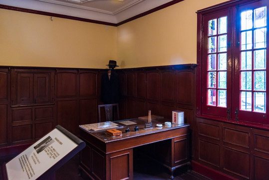 一楼朝南的一间面积约四十平方米是会客室,墙上挂着召开记者招待会使用的国民党军队进攻解放区形势图,当年周恩来多次在这里召开中外记者招待会。朝东的一间面积约14平方米,这是周恩来的工作室兼卧室。室内陈设非常简单,床上被子是办事处成立时发的,办公桌上是周恩来为上海各界人士于1946年10月4日举行公祭时,李公朴、闻一多在追悼大会上亲笔写的悼词和他阅读的一些书刊。周恩来经常在这里工作到深夜。中间的一间是饭厅,面积约20平方米,这是办事处工作人员吃饭的地方,周恩来、董必武在这里与大家一起用餐。