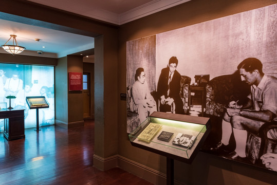 二楼整层楼面,是办事处外事人员的工作室兼卧室。陈列着收音机、英文打字机、油印机和编辑出版的《新华周刊》等物品。