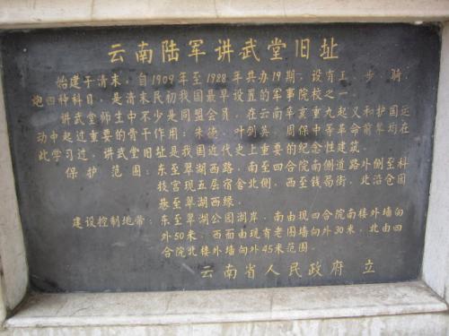 昆明市中心著名的翠湖公园西侧,是中国近代一所著名军事院校,建立时与讲武堂和奉天讲武堂并称三大讲武堂,现与军校、陆军军官学校齐名。开国元帅朱德同志曾称云南讲武堂是“革命熔炉”。1988年国务院正式公布云南陆军讲武堂遗址为全国重点文物保护单位。