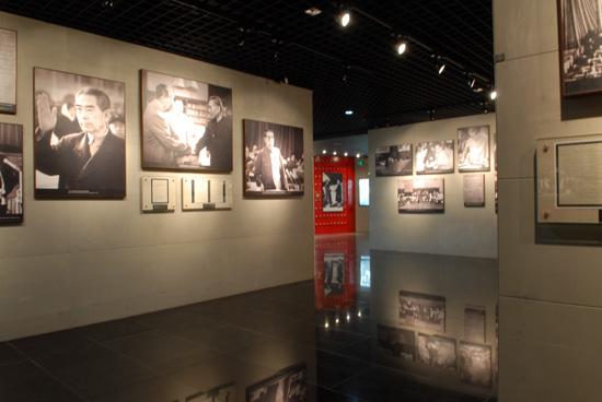 主馆分为三层,一层展厅共分八个部分,通过丰富翔实的文献史料和珍贵的文物图片以及5台电视显示屏,展现了周恩来光辉的一生。二层瞻仰厅置放着周恩来坐像。这尊汉白玉塑像高3.2米,基座高1.5米,展现的是周恩来总理手握长卷,微笑凝视着前方的伟人形象。