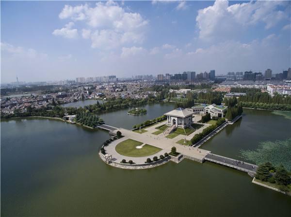 纪念馆正面隔湖望去,南面是观景台,它由廊厅和两座高达16米的剑碑组成,象征着周恩来的丰功伟绩与日月同辉。从这里乘游艇,可直达周恩来故居。