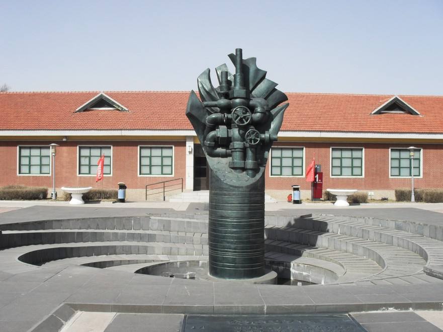 走进大门后,首先映入眼帘的是主题雕塑“起点·永续”。雕塑是以大庆油田发现井——松基三井井口装置为主体造型,地面部分高4.7米。