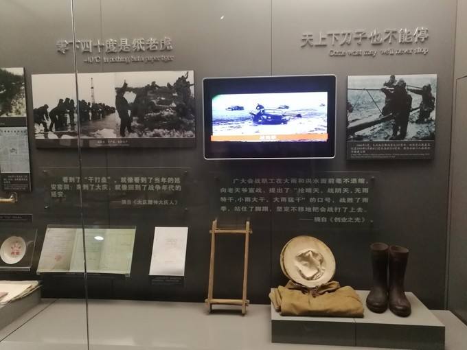 “大庆赤子,油田脊梁”。这一部分以红色基调烘托主题,展示了以余秋里、康世恩等油田领导、科技英才、模范人物、老会战等大庆各类群体,通过国画、多媒体查询、连环画电子书等高科技手段的综合利用,生动反映了“人民,只有人民才是创造历史的动力”的深刻主题。