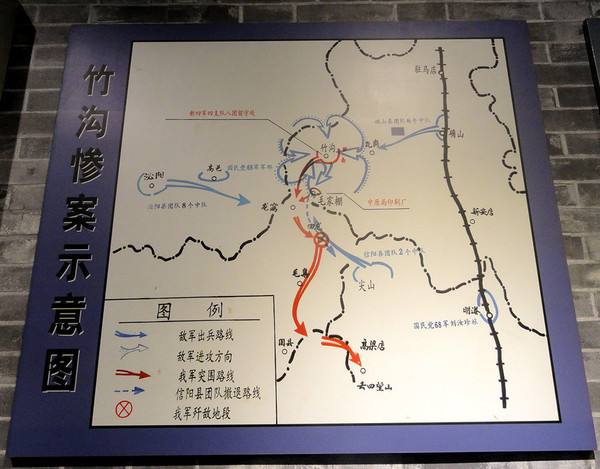 东展厅《竹沟惨案》。序厅是李先念为竹沟革命烈士凌园题词。展厅内容分为七部分 ; 一、撤离竹沟。主要内容: 1 、刘少奇率中原局撤离竹沟 ( 油画 );2 、刘少奇撤离竹沟的指示;3、刘少奇率中原局撤离竹沟的路线图。二、风雨欲来。主要内容:1 、指令 ;2、密函等。三、拂晓枪声。主要内容 :1 、耿明轩进攻竹沟命令 ;2 、奋勇阻击 ( 油画 ) 3 、胜利突围( 油画 ) 。四、竹沟惨案。主要内容 ;l 、竹沟惨案要图 ;2 、血腥屠杀 ( 油画 ) 等。五、著名烈士简历。六、竹沟革命烈士英名录。七、毛泽东同志褒扬先烈的语录等。