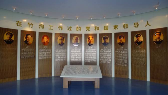 西展厅《中原烽火》。序厅主要有毛泽东子书' 星星之火,可以燎原' 。展厅内容为:1 、前言,简述竹沟革命垠据地历史地位, 竹沟出兵路线图 : 中原局辖区图 , 新四军二、四、五师和三、七师发展示意图;2 、在竹沟战斗和工作过的党和国家领导人; 刘少奇、李先念、张爱萍、张震、方毅、张到夫;3 、竹沟革命根据地创始人:王国华、周骏鸣、张星江、仝中玉 ;4 、省部级党政领导人:朱理治、陈少敏等 43 人;5 、人民军队将领 : 徐海东等大将,张爱萍等上将 , 王必成、方正平等中将 16 人; 王世仁、王绍渊少将等 52 人; 未授衔的军职干部:万一夫、毛世昌等 28 人;社会各界知名人士:范文澜、刘岘等 5 人 : 地级党政军干部 ;霍俊亭、万书才、邓德春等71人;6 、歌曲《竹沟山水美名传》。