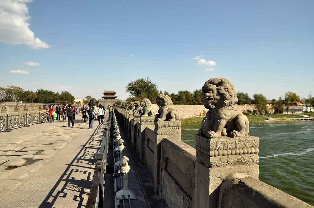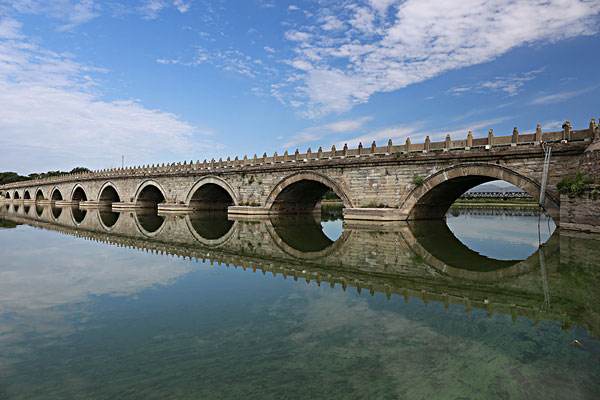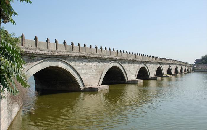 卢沟桥亦称芦沟桥,在北京市西南约15公里处,丰台区永定河上。因横跨卢沟河(即永定河)而得名,是北京市现存最古老的石造联拱桥。卢沟桥为十一孔联拱桥,拱洞由两岸向桥中心逐渐增大,拱券跨径从12.35米至13.42米不等,桥身中央微微突起93.5厘米,坡势平缓。河面桥长213.15米,加上两端的引桥,总长266.5米。桥身总宽9.3米。桥面宽7.5米。桥两侧雁翅桥面呈喇叭口状,入口处宽32米。桥面两侧设置石栏,南侧有望柱140根,北侧有141根。望柱间距约1.8米至2米,柱高1.4米。