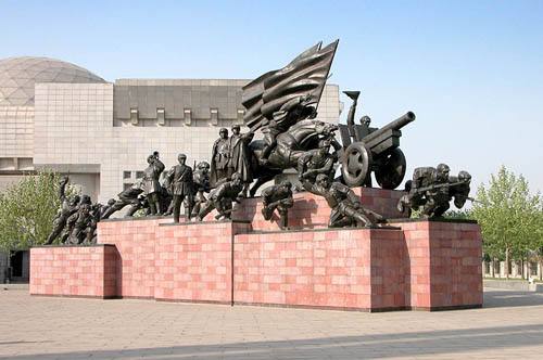 胜利广场占地1.1万平方米,其环境艺术以胜利为主题。开放式的前广场占地2300平方米,呈半圆形,红色连锁砖铺地,中央伫立着高15米的国旗旗杆,五星红旗高高飘扬。反映两军欢庆胜利和军民共庆胜利的两壁弧形花岗岩浮雕分列前广场两侧,由两根高12米、五种红色花岗岩砌成的圆柱构成胜利门,柱顶分别伫立着两尊高4.7米的人民解放军东北野战军和华北军区部队战士鸣枪欢庆胜利的锻铜塑像,象征着东北、华北两大区军民携手并肩夺取平津战役的胜利。通过胜利门进入占地8800平方米花岗岩铺地的主广场,东西两侧有各宽20米、高11米,象征两支大军勇往直前的《并肩作战》和象征军民之间鱼水情深的《人民支前》两组大型锻铜群雕以及火炮、坦克、装甲车等大型兵器布列。