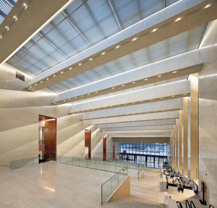 建筑共3层,最高处33米,主体部分结构形式为钢筋混凝土框架——剪力墙钢支撑结构,屋顶为钢网壳,建筑平面呈半圆形,直径达186米,基础形式为桩——承台基础。