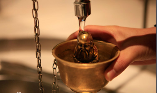 公道杯是中国古代一种奇特的酒器。使用此杯盛酒时,只能浅平,不可过满;否则,杯中之酒便会全部漏掉,一滴不剩。因此,这神奇的酒杯对贪杯者是个警策,对斟酒者公道与否也是个检验。 [6] 杯子的中间立着一位老寿星。他实际上是由两个圆柱体构成,外面圆柱体与杯衔接处有一暗孔,整个杯子构成一个虹吸管,当杯中的水超过某一个位置,水就会从小孔中流出,根据虹吸原理,水会一直流下去,直到杯中水流尽为止。