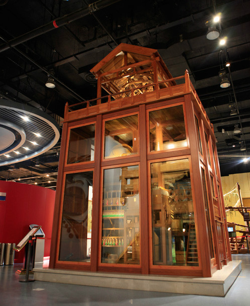 水运仪象台建于北宋元祐年间,距今900多年,台址位于北宋京城汴京(今河南省开封)。它是一座大型的天文钟,集计时报时、天文观测和星象显示三项功能于一体。其总高度将近12米,台底7米见方,堪称当时世界上最先进,技术综合程度最高的大型机械装置。 [10] 中国科学技术馆展示的是按书中记载制作的1:2比例复原模型。建造工作由当时的宰相苏颂领导,由通晓天文和机械技术的官员韩公廉等人负责设计。这座天文钟的结构分为三层:顶层为浑仪,用于观测星空;中层为浑象,用于显示星空;底层为动力装置及计时、报时机构,通过齿轮传动系统与浑仪、浑象相联,使这座三层结构的天文装置环环相扣,达到与天体同步运行。