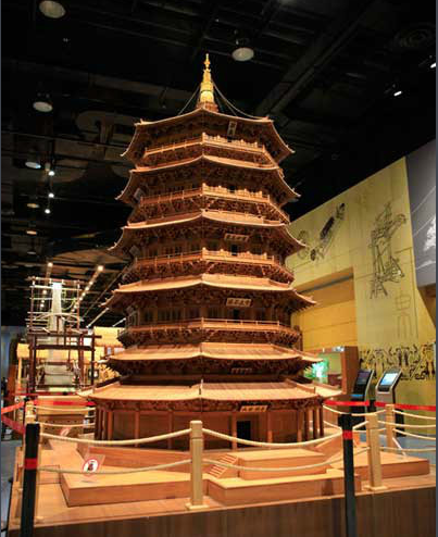 整座塔高67.31米,地面直径30.27米,呈平面八角形,外观为五层六檐,内设九层。塔身明暗各层都有内外两圈柱子,所有的柱子用梁枋连接成筒形的框架。榫卯结构提高了塔的柔韧性。塔的每层由平座、柱、斗拱和屋檐组成。全塔仅斗拱这一结构就达54种之多,用来承担外部走廊的重量,不仅实用,而且看上去精美复杂,显示出当时建筑技术的高超。 [8]