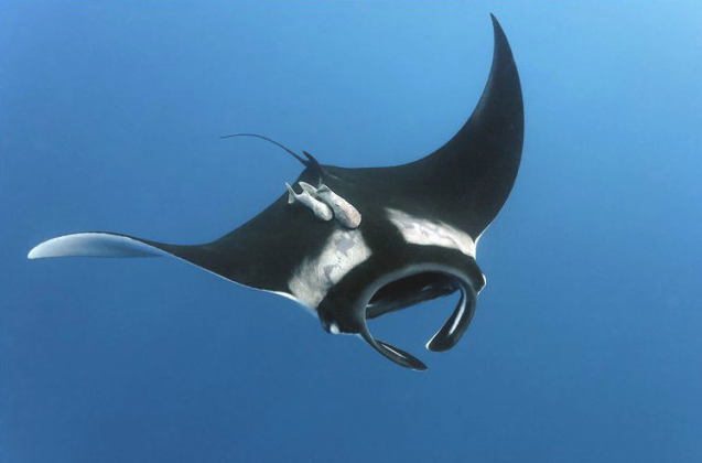 这个蝠鲼的标本采集于中国的东海,翼展是中国之最。它是双吻前口蝠鲼。属于暖水性上层鱼类。常利用其特有的大鳍,象展开翅膀般慢慢地上下摆动前进,有时也 会跳出水面。以浮游生物和小型鱼类为食。分布于热带和温带各海域。