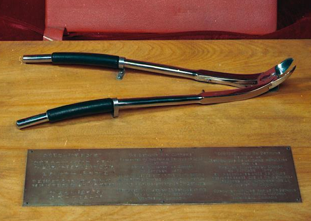 不锈钢质地,剪刀形。长33厘米,柄长为剪刀头的9倍,柄上安有橡皮抓手。现存完整。这是白求恩在加拿大设计发明并使用过的医疗器械。