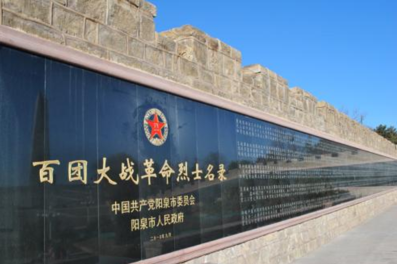 百团大战纪念馆位于阳泉市区西南5公里处的狮脑山主峰,建于1985年,由主碑、副碑、大型圆雕、题字碑、烽火台及“长城”组成,共占地25亩。纪念馆分上、下两个展厅,展览分“惊世壮举,辉煌战果”、“英雄史诗,宏伟工程”、“不朽精神,深刻教益”和纪念百团大战的书画四大部分,以100多幅珍贵照片、图片生动地再现了百团大战的英雄业绩。百团大战纪念碑(主碑)碑高40米,形如一把锋利的刺刀。正面镌刻着彭真题词:“战绩辉煌,永垂史册”;两侧分别为徐向前题词:“参加百团大战的烈士们永垂不朽”,薄一波题词:“百团大战,抗日战争中最光辉的一页,必将载诸史册,永放光芒”。在百团大战纪念碑建筑群周围,还修筑了供人们游览和休息的狮子阁、钟亭、蘑菇亭,并种植了大片林木,使具有光辉革命历史的狮脑山峰,更加美丽壮观。1997年被中宣部命名为全国爱国主义教育示范基地,列入全国红色旅游经典景区二期名录。2010年,百团大战纪念馆新馆落成并对外开放,其展示水平与服务功能进一步完善。