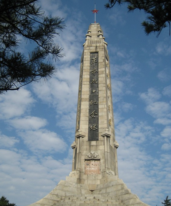 烈士纪念馆对面的山坡上是雄伟的革命烈士纪念塔,建成于1956年10月。占地面积3472.5平方米,塔高28米,塔基由五角星和圆形图案构成,塔身呈等边五棱形,花岗岩石结构,建筑面积1134平方米。2001年由政府出资对塔身题字进行了铂金处理,2002年又对塔座及台阶进行重新修葺。修葺后的纪念塔焕然一新,在阳光的照耀下熠熠生辉。
