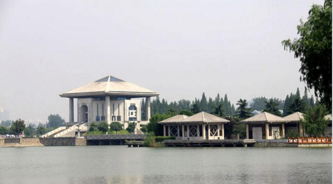 周恩来纪念馆,馆区由一组纪念性建筑群、一个纪念岛、三个人工湖和环湖四周的绿地组成。总占地面积40万平方米,其中百分之七十为水面。岛上建有主馆和附馆,主附两馆总建筑面积为3265平方米,其中主馆1918平方米,附馆1347平方米,其余还有岚山诗碑、海棠林、海棠路、樱花路、五龙亭、怀恩亭、西厅观鱼等。