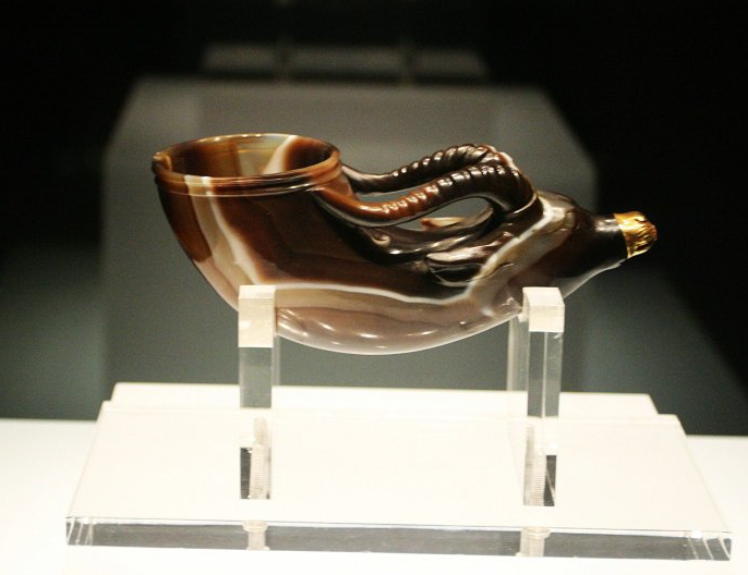 镶金兽首玛瑙杯唐代,国之重宝,海内孤品,中国首批禁止出国(境)展览文物,陕西历史博物馆镇馆之宝。酒器,长15.5厘米,口径5.9厘米。镶金兽首玛瑙杯选材精良,巧妙利用玉料的俏色纹理雕琢而成。杯体为角状兽首形,兽双角为杯柄。嘴部镶金帽,眼、耳、鼻皆刻划细微精确。从选材、设计到工艺,都可称为唐代玉雕艺术的精品,是迄今发现唐代唯一一件俏色玉雕,是唐代玉器做工最精湛的一件,也是唐代中外文化交流的产物