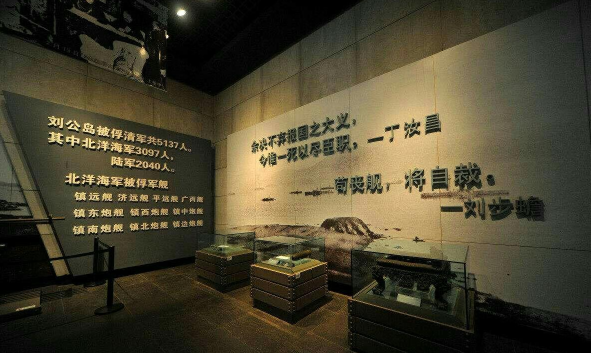 北洋海军提督署是中国第一支近代海军的指挥中枢,是国内仅存的、保存完好的清代高级军事衙门,占地1.7万平方米。馆内收藏着近千件珍贵历史文物,海底打捞出水的济远舰前双主炮,每门重达20多吨;内容丰富的塑像、沙盘、模型、图片文物等陈列展览,生动再现了北洋海军兴衰、甲午战争始终的历史。北洋海军将士纪念馆中有长达18.88米、寓意北洋海军1888年成军的北洋海军将士名录墙,铭刻着近600位北洋海军将士的姓名、职衔。刘公岛水师学堂是清末四所近代海军学堂中惟一一座规模完整、有迹可寻的学堂。