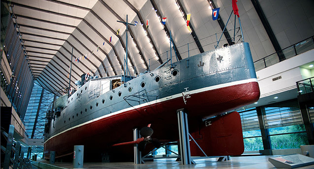 《中山舰舰体复原陈列》——根据史料还原历史真实,按民国十四年(1925年)中山舰原貌复原舰体外观及舰载装备、设施和部分舱室,保留了民国二十七年(1938年)武汉会战时的创伤痕迹,将舰体视为一个大文物陈列于博物馆舰体陈列大厅内,四周展出中山舰被整体打捞、修复、迁移的历史过程及中山舰大事记等相关辅助内容。