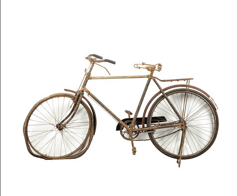 自行车:中山舰共出水自行车残骸5辆,这辆完整的自行车,是工作人员用这些残骸拼起来的。