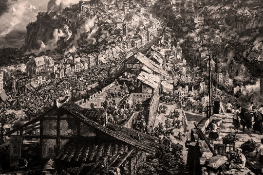 1938年至1943年间日机空袭重庆(含对空监视范围)203次,出动飞机437批,9166架次,炸、焚毁房屋17452栋,37182间,造成人员伤亡2、5万余人。其间的1941年6月5日晚,日机24架分三批偷袭重庆,在5个多小时的疲劳轰炸中,渝中区十八梯、石灰市和演武厅(现磁器街)三段防空隧道内,发生了震惊中外、惨不忍睹的避难民众窒息、践踏惨案,造成人员伤亡2500人左右。