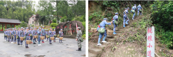 身穿红衣,手持红枪,学员们踏上了“挑粮小道”,重回井冈山红色道路。