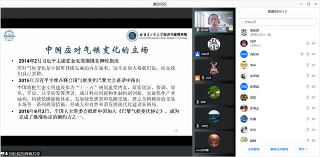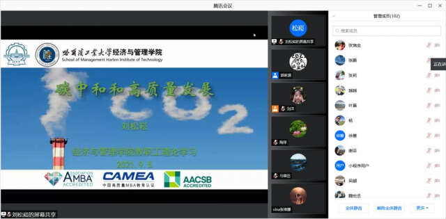刘松崧老师依次介绍了什么是“碳达峰”、“碳中和”,以及由经管学院院长叶强申请成立的以实现全社会碳中和为目标,研究碳中和管理中的相关技术和模式,旨在探索区块链、人工智能和金融科技新理论、新方法的哈尔滨工业大学经管学院碳中和研究中心。刘老师围绕全球气候变暖、全球减排情景以及我国应对气候变暖的立场等背景与形式,“碳达峰”和“碳中和”等相关概念与解析,我国“双碳”目标提出的背景、“碳中和”的意义及我国经济社会发展趋势、我国实现“碳中和”面临的挑战、路径与措施、机遇与前景等分别进行了深入透彻的讲解。