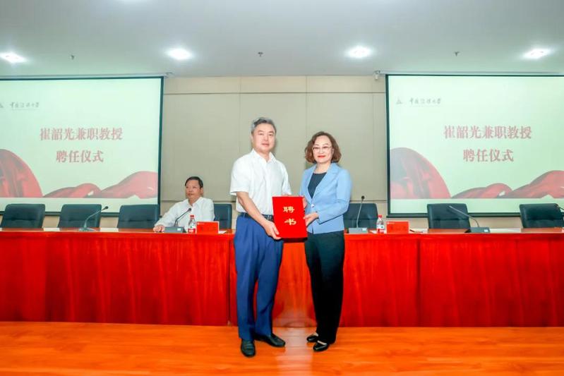 专题报告会前,学校在明德报告厅举行聘任仪式,聘请崔韶光老师担任中国传媒大学马克思主义学院兼职教授。