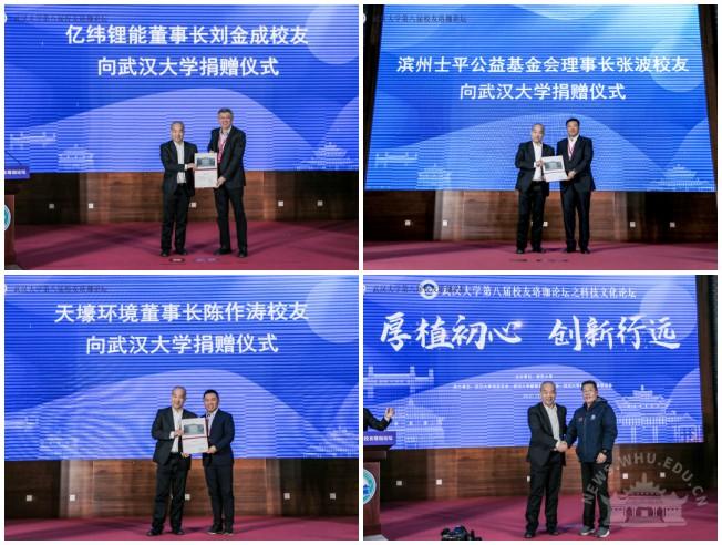 在此次论坛上,惠州亿纬锂能股份有限公司董事长刘金成、山东魏桥创业集团董事长张波、天壕环境股份有限公司董事长陈作涛、广东宏巨投资集团有限公司董事长陈军等校友纷纷向母校捐赠,带来了一份份惊喜厚礼,支持母校的建设和发展。