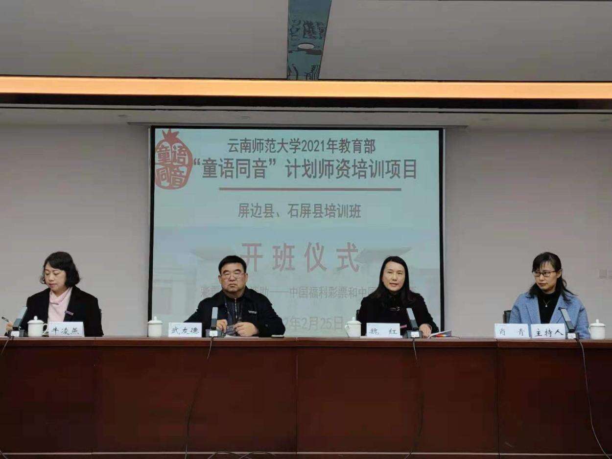 2月25日上午,由教育部语用司主办,云南师范大学国家语言文字推广基地和传媒学院共同承办的“教育部2021‘童语同音’计划师资培训”项目屏边县、石屏县培训,在传媒学院举行线上开班仪式。我校副校长、国家语言文字推广基地执行主任武友德教授,传媒学院院长、国家语言文字推广基地执行副主任魏红教授,传媒学院副院长牛凌燕,国家语言文字推广基地办公室副主任肖青,石屏县教育体育局副局长乔鸿、教育科科长罗永发,屏边县教育体育局基教科、职成教科科长包卫源,以及参加培训的屏边县、石屏县200名幼儿园教师参加了开班仪式。开班仪式由肖青副主任主持。
