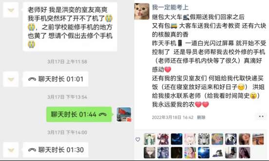 点击教育和管理的切换键,学工人在线上也是24小时不停转地永动“陀螺”,他们通过讲座、班会、座谈、党团日等形式,系统开展爱党爱国、诚信守法、科学防疫等专题教育,充分发挥网络思政育人功能,打造思政引领“云课堂”。他们高度关注同学们的心理健康,注重将解决心理问题与解决具体困难相结合,通过开展个体咨询、谈心谈话等工作,帮助同学们化解心理问题,减轻焦虑情绪。网课信号好坏、饭菜是否可口,宿舍温度如何,他们认真倾听学生的成长诉求和意见建议,直面问题,快速解答,成为学校与学生相互理解、共克时艰的桥梁。学工人还分阶段开展线上家访,将心比心与家长进行交流,凝聚家校育人合力,让家长放心,让学生暖心。食品学院粮食2001班的姜泽华同学说:“在这场防疫大战中,辅导员老师们就是我们的点点荧光,在每一名同学有需要的时刻,他们都会像‘超人’一样出现,守护着我们的安全”。经济管理学院工商1901班的杨凯然同学说:“感谢学校竭尽全力守护我们的平安健康,我们现在学的安心、吃的放心、住的舒心,希望疫情快点过去,希望我们的校园早日回到从前的样子。”