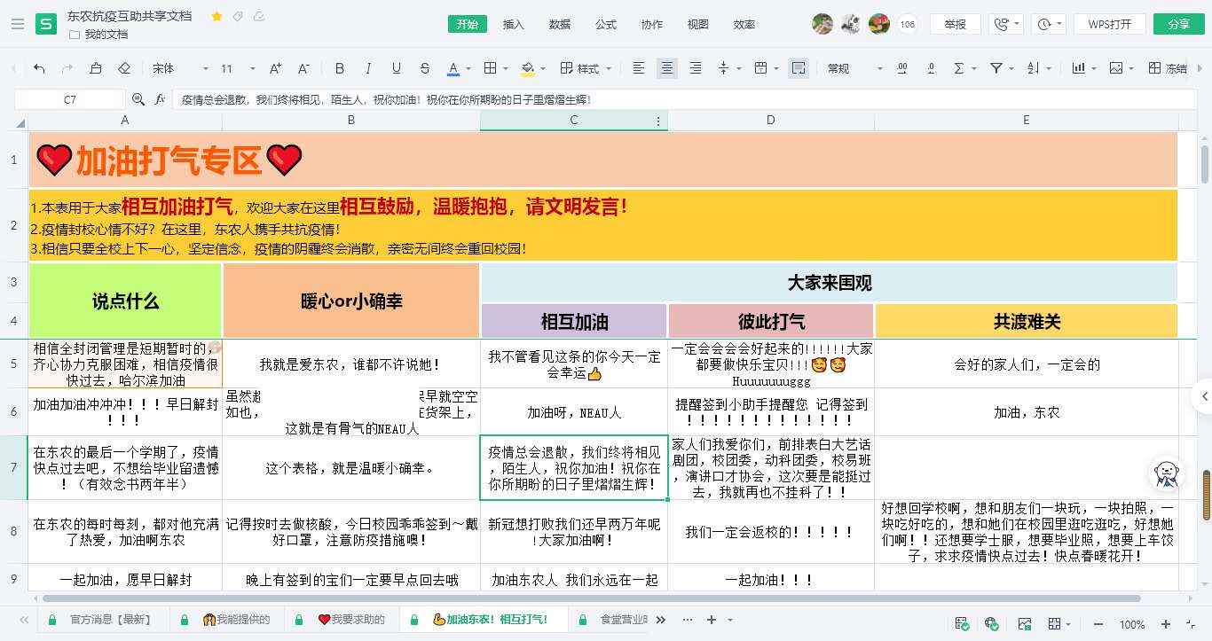 “大家好温暖,真的很感谢学校的互助平台,我急需的物品很快就解决了”——为满足广大同学在学校全封闭管理期间学习、生活、健康等方面的实际需求,学生工作部充分利用互联网,设计发起了《东农抗疫互助共享文档》,分为“官方消息”“我能提供的”“我要求助的”“加油东农!相互打气!”四个部分。其中,“官方消息”中公布了校园内各部门封闭管理期间服务电话,随时跟进更新学校各类官方通知,并向全体同学发出齐心抗疫、守望相助的倡议和号召。文档一经发布,就得到了广大同学的高度关注和积极响应。仅半天时间,就有700余名同学发布了可提供物品或帮助的信息,200余名同学发布了求助物品信息。学生工作部还组织了专门力量对共享表格进行更新管理,并在后续工作中结合同学们的实际需求不断完善,与全体同学们共同期待疫去春来,丁香盛开。