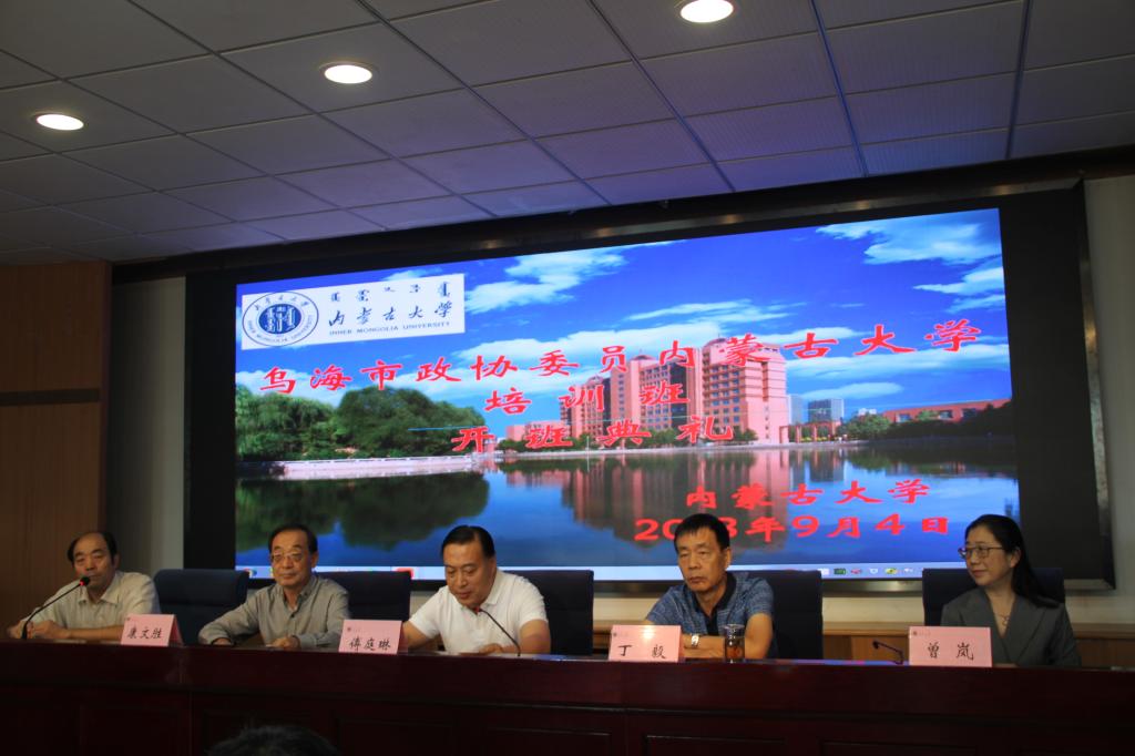 内蒙古的九月,天高云淡,金风送爽。在这硕果累累的收获季节里,来自内蒙古自治区乌海市的70多位政协委员,在乌海市政协副主席傅庭琳同志的带领下,齐聚内蒙古大学,开启了为期7天的集中培训。9月4日上午,乌海市政协委员综合素能提升培训班开班典礼在我校隆重举行。我校继续教育学院副院长曾岚、乌海市政协副主席、市农工党主委康文胜,乌海市政协党组成员、副主席傅庭琳、乌海市政协党组成员、副主席丁毅,内蒙古大学继续教育院学员培训部执行主任马晓利以及全体学员参加了开班典礼。