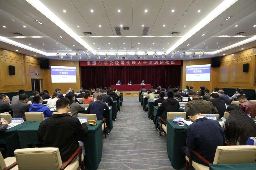 江西省鹰潭市非公经济代表人士高级研修班开班典礼在我校如心会议中心大报告厅举行,我校党委书记曹淑敏,鹰潭市政协副主席、工商联主席吴泉水,我校副校长张广出席典礼,研修班60余名学员参加典礼。
