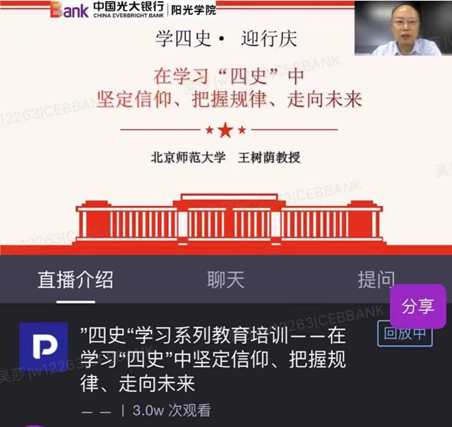 北京师范大学继续教育与教师培训学院下设的企业发展中心始终紧贴企业实际,着眼解决企业人员学习与发展的实际问题,依托北京师范大学在历史、马克思主义研究等方面的学科优势与独特的资源,打造开发精品课程,不断满足企业开展和深入推进“四史”学习教育的需求。本次“四史”教育线上培训适值光大银行29周年行庆,企业发展中心选配北京师范大学“四史”领域知名专家教授以在线的形式及时满足了银行的学习需求,有力推动了光大银行“四史”学习教育的深入开展,是光大银行29周年行庆和筑牢企业之魂的重要活动。