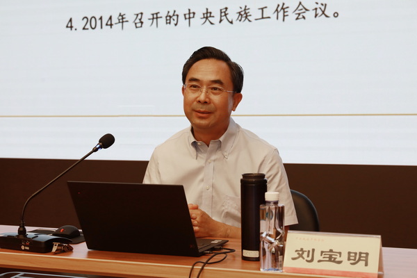 中央民族公务人员学院民族公务人员教育研究中心主任、中央民族公务人员学院“党的民族工作研究与宣讲创新团队”负责人刘宝明教授作铸牢中华民族共同体意识专题辅导。他从深刻认识中央民族工作会议的重大意义、深刻把握提出的新思想新论断新要求、把握紧紧围绕铸牢中华民族共同体意识目标任务推动新时代民族工作高质量发展三个方面,从理论与实践相结合、历史与现实相结合、深刻分析与生动故事相结合的角度,讲述了什么是中华民族共同体意识、为什么要铸牢中华民族共同体意识、铸牢什么样的中华民族共同体意识、怎样铸牢中华民族共同体意识等最基本最重要的问题,进一步加深了对铸牢中华民族共同体意识的认识,对深入学习贯彻中央民族工作会议精神、推动学校工作高质量发展具有深刻的启发意义。